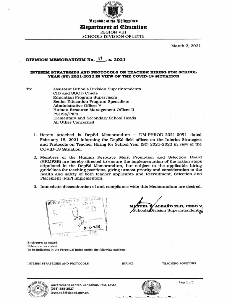 Dm No 117 S 2021 Interim Strategies And Protocols On Teacher Hiring For School Year 2021 2022 In View Of The Covid 19 Situation Pdf